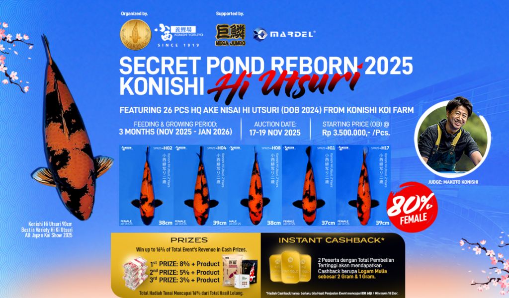 Event Secret Pond Reborn 2025 kali ini menghadirkan 26 Ekor Hi Utsuri ternakan Konishi Koi Farm yang kami datangkan pada bulan Agustus lalu sebagai Jumbo Tosai (DoB 2024). Pada ajang All Japan Koi Show 2025, pemenang Best in Variety Hi Ki Utsurimono adalah Hi Utsuri berukuran 90cm dari Konishi Konishi Koi Farm. Ikan-ikan pada event GO kali ini merupakan Hi Utsuri yg dihasilkan dari bloodline yang sama dan rata-rata memiliki bentuk badan, juga struktur tulang yang sangat baik untuk dibesarkan.